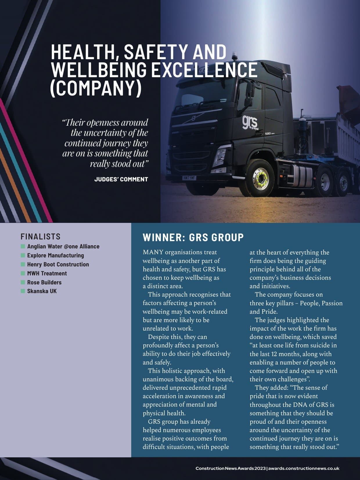 GRS Chief Executive Jon Fisher said: “Even making the shortlist in the CN Awards is a major achievement, so to go on to win the award – beating stiff competition from some of the construction industry’s big names – is a stunning achievement. It is a testament to the commitment of each and every one of our employees in embracing the spirit of ‘Let’s Talk’ to look after ourselves and look out for each other.