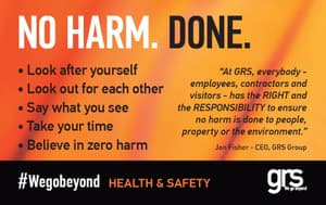 In 2018, GRS launched a powerful behavioural safety campaign aimed at employees, contractors and others working alongside GRS. Entitled “No Harm. Done.” the campaign emphasises that every person has the right and the responsibility to ensure no harm is caused to people, property or the environment.